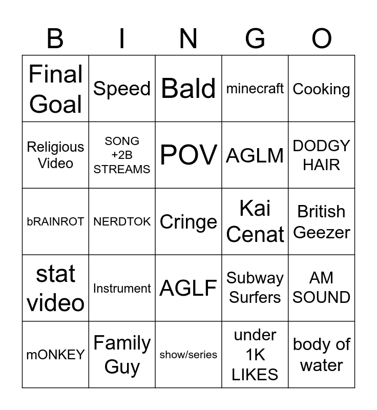 This bingo card has a free space and 24 words: Instrument, Family Guy, POV, mONKEY, Cooking, Final Goal, Religious Video, Speed, Kai Cenat, AGLF, AGLM, bRAINROT, Subway Surfers, AM SOUND, SONG +2B STREAMS, under 1K LIKES, British Geezer, Bald, DODGY HAIR, NERDTOK, body of water, stat video, minecraft and show/series.