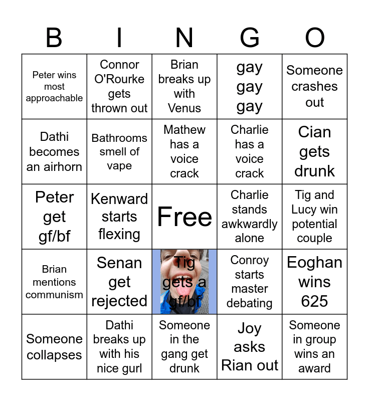 This bingo card has 1 images, a free space and 24 words: Senan get rejected, Dathi breaks up with his nice gurl, Mathew has a voice crack, Someone collapses, Someone crashes out, Peter wins most approachable, Dathi becomes an airhorn, Connor O'Rourke gets thrown out, Charlie stands awkwardly alone, Tig gets a gf/bf, Charlie has a voice crack, Peter get gf/bf, Conroy starts master debating, Eoghan wins 625, Bathrooms smell of vape, Joy asks Rian out, Tig and Lucy win potential couple, Brian breaks up with Venus, Cian gets drunk, Kenward starts flexing, Someone in group wins an award, Brian mentions communism, gay gay gay and Someone in the gang get drunk.