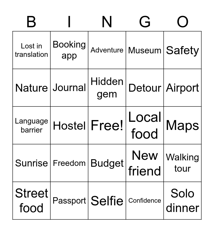 This bingo card has a free space and 30 words: Passport, Backpack, Hostel, Flight delay, Lost in translation, Adventure, Journal, Budget, Local food, Selfie, Maps, Solo dinner, Confidence, Flexibility, Airport, Culture shock, New friend, Sunrise, Freedom, Safety, Language barrier, Train ride, Booking app, Detour, Nature, Museum, Walking tour, Street food, Hidden gem and Free space.
