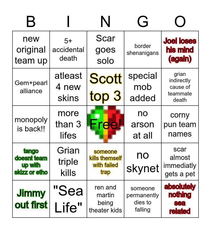 This bingo card has a free space and 24 words: Jimmy out first, Grian triple kills, Scott top 3, someone permanently dies to falling, Joel loses his mind (again), new original team up, 5+ accidental death, Scar goes solo, no arson at all, corny pun team names, monopoly is back!!, atleast 4 new skins, no skynet, scar almost immediatly gets a pet, Gem+pearl alliance, "Sea Life", ren and martin being theater kids, border shenanigans, grian indirectly cause of teammate death, tango doesnt team up with skizz or etho, more than 3 lifes, someone kills themself with failed trap, special mob added and absolutely nothing sea related.