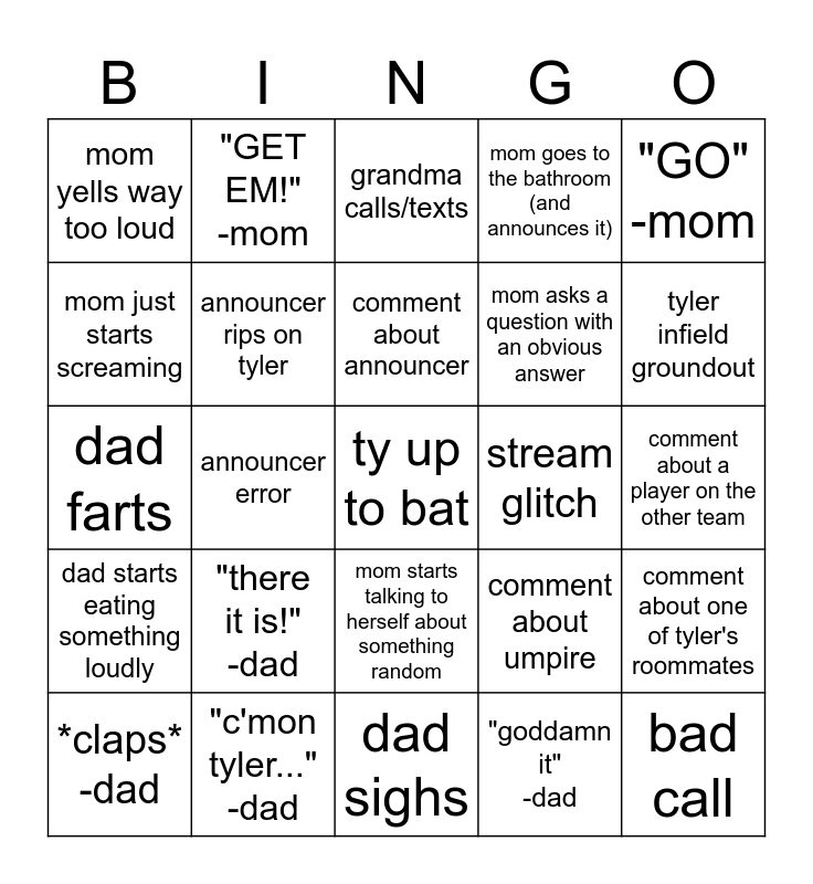 This bingo card has a free space and 24 words: "there it is!" -dad, "c'mon tyler..." -dad, comment about announcer, *claps* -dad, "GO" -mom, mom yells way too loud, mom just starts screaming, "GET EM!" -mom, stream glitch, mom starts talking to herself about something random, mom asks a question with an obvious answer, dad farts, comment about umpire, comment about one of tyler's roommates, announcer rips on tyler, "goddamn it" -dad, comment about a player on the other team, grandma calls/texts, tyler infield groundout, announcer error, bad call, dad starts eating something loudly, mom goes to the bathroom (and announces it) and dad sighs.