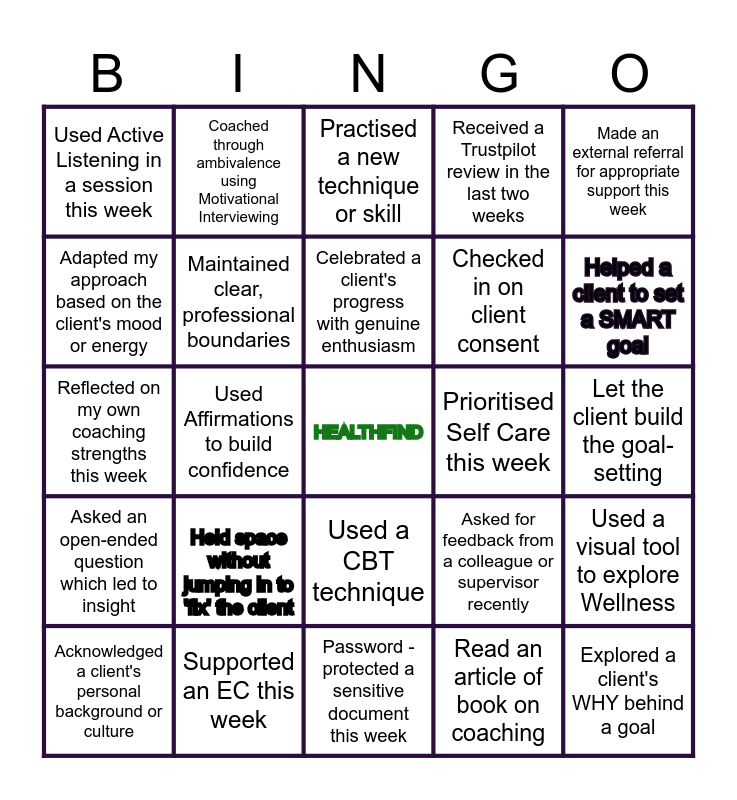 This bingo card has a free space and 24 words: Held space without jumping in to 'fix' the client, Supported an EC this week, Celebrated a client's progress with genuine enthusiasm, Acknowledged a client's personal background or culture, Made an external referral for appropriate support this week, Used Active Listening in a session this week, Adapted my approach based on the client's mood or energy, Coached through ambivalence using Motivational Interviewing, Prioritised Self Care this week, Used a CBT technique, Checked in on client consent, Reflected on my own coaching strengths this week, Asked for feedback from a colleague or supervisor recently, Used a visual tool to explore Wellness, Maintained clear, professional boundaries, Read an article of book on coaching, Let the client build the goal-setting, Practised a new technique or skill, Helped a client to set a SMART goal, Used Affirmations to build confidence, Explored a client's WHY behind a goal, Asked an open-ended question which led to insight, Received a Trustpilot review in the last two weeks and Password -protected a sensitive document this week.