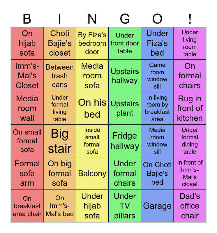 This bingo card has 36 words: On small formal sofa, Big stair, Under hijab sofa, Upstairs hallway, In living room by breakfast area, Rug in front of kitchen, On hijab sofa, On Imm's-Mal's bed, By Fiza's bedroom door, Under formal chairs, Game room window sill, Under living room table, Formal sofa arm, Under formal living table, Media room sofa, Under front door table, On Choti Bajie's bed, Under formal dining table, Imm's-Mal's Closet, Between trash cans, Inside small formal sofa, Fridge hallway, Media room window sill, In front of Imm's-Mal's closet, Media room wall, Choti Bajie's closet, On his bed, Under TV pillars, Under Fiza's bed, On formal chairs, On breakfast area chair, On big formal sofa, Balcony, Upstairs plant, Garage and Dad's office chair.