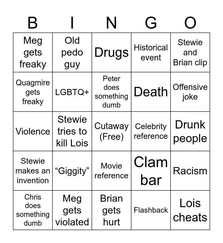 This bingo card has a free space and 24 words: “Giggity”, Meg gets violated, Peter does something dumb, Chris does something dumb, Stewie and Brian clip, Meg gets freaky, Quagmire gets freaky, Old pedo guy, Celebrity reference, Movie reference, Death, Violence, Clam bar, Racism, LGBTQ+, Flashback, Drunk people, Drugs, Offensive joke, Stewie tries to kill Lois, Lois cheats, Stewie makes an invention, Historical event and Brian gets hurt.