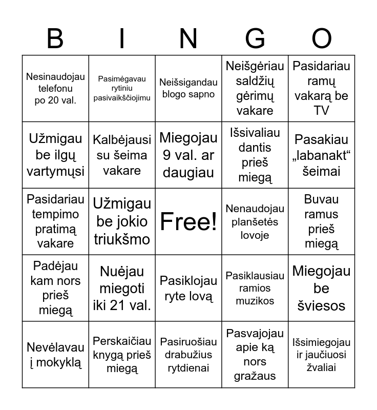 This bingo card has a free space and 24 words: Nuėjau miegoti iki 21 val., Perskaičiau knygą prieš miegą, Miegojau 9 val. ar daugiau, Nevėlavau į mokyklą, Pasidariau ramų vakarą be TV, Nesinaudojau telefonu po 20 val., Užmigau be ilgų vartymųsi, Pasimėgavau rytiniu pasivaikščiojimu, Nenaudojau planšetės lovoje, Pasiklojau ryte lovą, Išsivaliau dantis prieš miegą, Pasidariau tempimo pratimą vakare, Pasiklausiau ramios muzikos, Miegojau be šviesos, Kalbėjausi su šeima vakare, Pasvajojau apie ką nors gražaus, Buvau ramus prieš miegą, Neišsigandau blogo sapno, Pasakiau „labanakt“ šeimai, Užmigau be jokio triukšmo, Išsimiegojau ir jaučiuosi žvaliai, Padėjau kam nors prieš miegą, Neišgėriau saldžių gėrimų vakare and Pasiruošiau drabužius rytdienai.