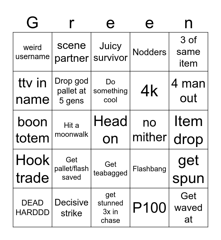 This bingo card has 25 words: Get pallet/flash saved, get stunned 3x in chase, Do something cool, DEAD HARDDD, 3 of same item, weird username, ttv in name, scene partner, no mither, Get teabagged, 4k, boon totem, Flashbang, get spun, Drop god pallet at 5 gens, Get waved at, Item drop, Juicy survivor, 4 man out, Hit a moonwalk, Head on, Decisive strike, Hook trade, Nodders and P100.