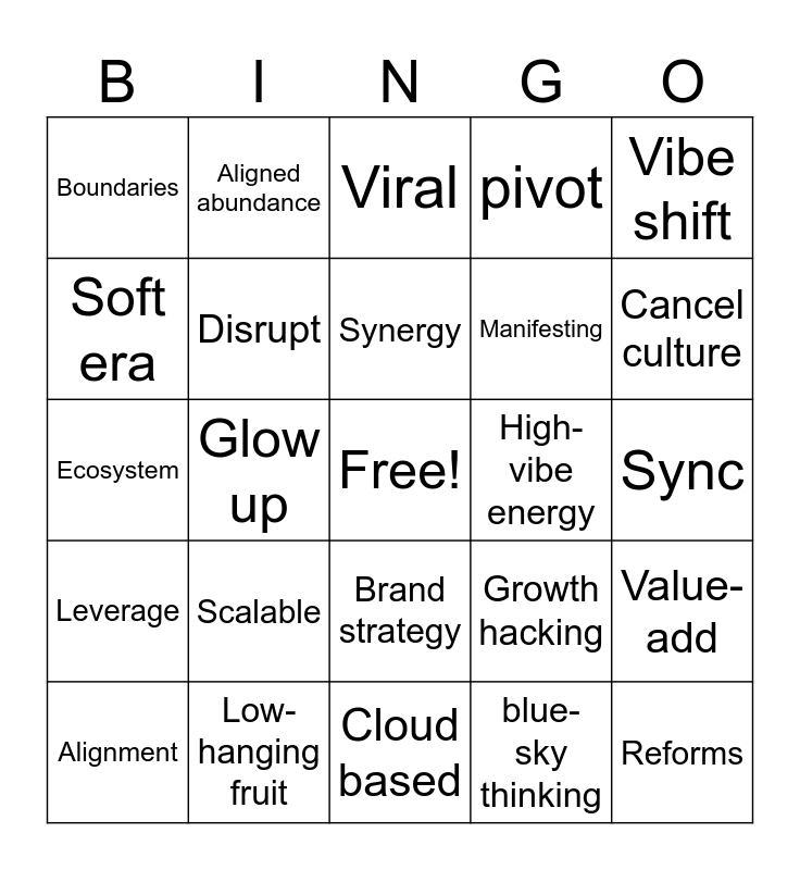 This bingo card has a free space and 25 words: Scalable, Cloud based, Synergy, Alignment, Vibe shift, Boundaries, Soft era, Aligned abundance, High-vibe energy, Brand strategy, Manifesting, Ecosystem, Growth hacking, Value-add, Disrupt, Onboard, Sync, Viral, Cancel culture, Glow up, Reforms, Low-hanging fruit, Leverage, pivot and blue-sky thinking.