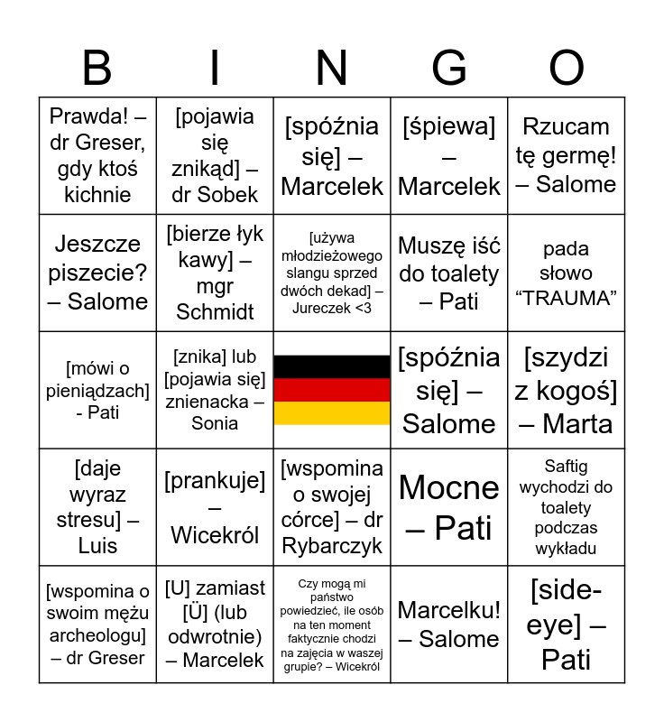 This bingo card has a free space and 39 words: TEKSTY DO BINGO:, Aha – Wicekról, Zapytajcie doktora Woźniaka, on na pewno będzie wiedział – ktokolwiek, [bierze łyk kawy] – mgr Schmidt, [wspomina o swoim mężu archeologu] – dr Greser, [wspomina o swojej córce] – dr Rybarczyk, [używa młodzieżowego slangu sprzed dwóch dekad] – Jureczek <3, Mam takie małe pytanko… – Ania, Rzucam tę germę! – Salome, [daje wyraz stresu] – Luis, [znika] lub [pojawia się] znienacka – Sonia, [śpiewa] – Marcelek, [side-eye] – Pati, [szydzi z kogoś] – Marta, [spóźnia się] – Salome, [prankuje] – Wicekról, [zapomina czegoś oddać] – Liebe, Prawda! – dr Greser, gdy ktoś kichnie, Dziękuję, Pani Sofio, nie wiem, co bym bez Pani zrobił – Jureczek, Mocne – Pati, Jeszcze piszecie? – Salome, Czy mogą mi państwo powiedzieć, ile osób na ten moment faktycznie chodzi na zajęcia w waszej grupie? – Wicekról, Muszę iść do toalety – Pati, pada słowo “TRAUMA”, alkoholizacja grupowa na okienku lub po zajęciach, karaoke u Luis, [wspomina o pierworodnej] – Salome, [wspomina o drugorodnej] – Salome, [filozoficzna gadka] – dr Płomińska-Krawiec, [pojawia się znikąd] – dr Sobek, [wspomina, że jesteśmy lepsi od innych] – dr Rybarczyk, [awaria sprzętu elektronicznego], [spóźnia się] – Marcelek, [U] zamiast [Ü] (lub odwrotnie) – Marcelek, Marcelku! – Salome, ktoś z prowadzących wspomina o panu Darku, Saftig wychodzi do toalety podczas wykładu, [mówi o pieniądzach] - Pati and [jest wzywany] - Pan Darek.
