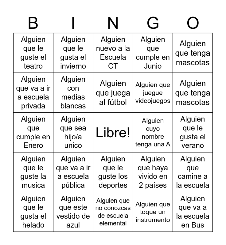 This bingo card has a free space and 24 words: Alguien que va a ir a escuela pública, Alguien que este vestido de azul, Alguien que juega al fútbol, Alguien que le gusta el helado, Alguien que tenga mascotas, Alguien que le guste el teatro, Alguien que va a ir a escuela privada, Alguien que le gusta el invierno, Alguien cuyo nombre tenga una A, Alguien que le guste los deportes, Alguien que juegue videojuegos, Alguien que cumple en Enero, Alguien que haya vivido en 2 países, Alguien que camine a la escuela, Alguien con medias blancas, Alguien que toque un instrumento, Alguien que le gusta el verano, Alguien nuevo a la Escuela CT, Alguien que tenga mascotas, Alguien que sea hijo/a unico, Alguien que va a la escuela en Bus, Alguien que le guste la musica, Alguien que cumple en Junio and Alguien que no conozcas de escuela elemental.