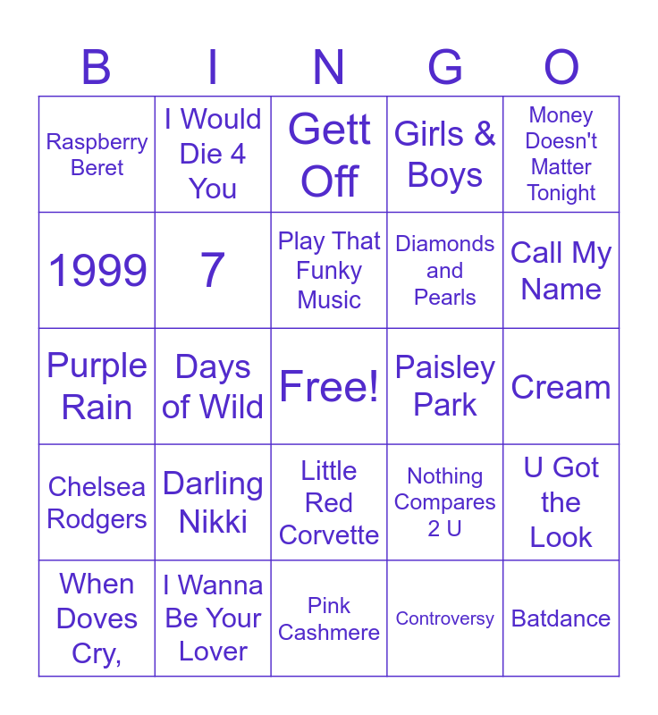 This bingo card has a free space and 24 words: Darling Nikki, I Wanna Be Your Lover, Play That Funky Music, When Doves Cry,, Money Doesn't Matter Tonight, Raspberry Beret, 1999, I Would Die 4 You, Paisley Park, Little Red Corvette, Diamonds and Pearls, Purple Rain, Nothing Compares 2 U, U Got the Look, 7, Controversy, Cream, Gett Off, Call My Name, Days of Wild, Batdance, Chelsea Rodgers, Girls & Boys and Pink Cashmere.