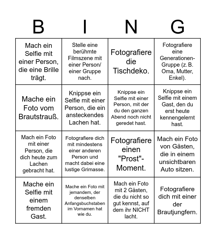 This bingo card has 43 words: Mache ein Foto von dir mit deinem Lieblingsgetränk des Tages., Mache ein Selfie mit einem fremden Gast., Mache ein Foto von Tanzenden auf der Tanzfläche., Fotografiere das Abendessen., Fotografiere das schönste Dessert auf dem Tisch., Fotografiere die Hochzeitstorte., Fotografiere die Tischdeko., Halte das liebevollste Detail der Tischdeko fest., Mache ein Foto vom Brautstrauß., Mach ein Gruppenfoto von mindestens 4 Personen., Fotografiere eine Generationen-Gruppe (z. B. Oma, Mutter, Enkel)., Mache ein Foto mit jemandem, der denselben Anfangsbuchstaben im Vornamen hat wie du., Finde Gäste mit ähnlichem Outfit – Doppelgänger-Foto!, Fotografiere die Hochzeits-Location von außen., Mache ein Foto von der Braut, ohne dass sie direkt in die Kamera schaut., Mache ein Foto vom Bräutigam, ohne dass er direkt in die Kamera schaut., Fotografiere das Brautpaar beim Lachen., Fotografiere einen "Prost"-Moment., Fotografiere ein glitzerndes Detail., Fotografiere dich mit mindestens einer anderen Person und macht dabei eine lustige Grimasse., Stelle eine berühmte Filmszene mit einer Person/ einer Gruppe nach., Gruppenfoto: alle formen ein Herz mit ihren Händen/Fingern., Mach ein Foto mit einem der Angestellten (Servicekräfte, DJ, Fotografin etc)., Mach ein Selfie mit einer Person, die eine Brille trägt., Fotografiere dich mit der Person, die das schönste Outfit trägt (Brautpaar zählt nicht)., Mach ein Foto mit 2 Gästen, die du nicht so gut kennst, auf dem ihr NICHT lacht., Fotografiere dich mit deiner neuen Band. ALLE haben ein imaginäres Instrument in der Hand., Finde jemanden, der eine ähnliche Farbe trägt wie du (Brautjungfern & Trauzeugen zählen nicht)., Mach ein Foto mit einem der beiden Trauzeugen., Fotografiere dich mit einer der Brautjungfern., Fotografiere dich mit einem der Groomsmen., Fotografiere deinen liebsten Programmpunkt/ deine liebste Aktion., Fotografiere Personen im Gespräch., Mach ein Foto von Gästen, die in einem unsichtbaren Auto sitzen., Mach ein Selfie mit einer Person, die gerade an der Bar steht., Knippse ein Selfie mit deinem Lieblingsmenschen., Knippse ein Selfie mit einer Person, die du schon länger als 5 Jahre kennst., Knippse ein Selfie mit einem Gast, den du erst heute kennengelernt hast., Knippse ein Selfie mit einer Person, die ein ansteckendes Lachen hat., Mach ein Foto mit einer Person, die dich heute zum Lachen gebracht hat., Mach ein Foto mit einer Person, die ordentlich für Stimmung sorgt., Knippse ein Selfie mit einer Person, mit der du den ganzen Abend noch nicht geredet hast. and Fotografiere dich mit 2 Personen, die ein sichtbares Tattoo haben. Die Tattoos müssen auf dem Bild zu sehen sein..