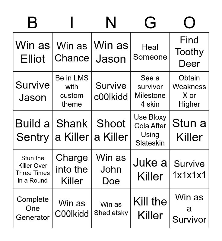 This bingo card has a free space and 44 words: Be the Only Survivor, Win as a Survivor, Revive as Two Time, Complete One Generator, Emote on a Killer, Kill the Killer, Win as Jason, Die in the First Twenty Seconds, Find Toothy Deer, Win as C00lkidd, Heal Someone, Use Bloxy Cola After Using Slateskin, Win as John Doe, Charge into the Killer, Successfully Land Three Coin Flips in a Row, Win as Shedletsky, Win as Noob, Build a Sentry, Win as a Killer, Obtain Weakness X or Higher, Win as Chance, Win as 007n7, Trick a Killer (007n7), Win as Elliot, Win as Killer, Stun a Killer, Win as 1x1x1x1, Win as Builderman, Juke a Killer, Stun the Killer Over Three Times in a Round, Use Rush Hour, Survive 1x1x1x1, Win as Guest 1337, Build a Health Dispenser, Shank a Killer, Win as Two Time, Win as a Survivor with Under 20 Health, Survive John Doe, Survive c00lkidd, Survive Jason, See a survivor Milestone 4 skin, See a Killer milestone 4 skin, Be in LMS with custom theme and Make a Killer limp.