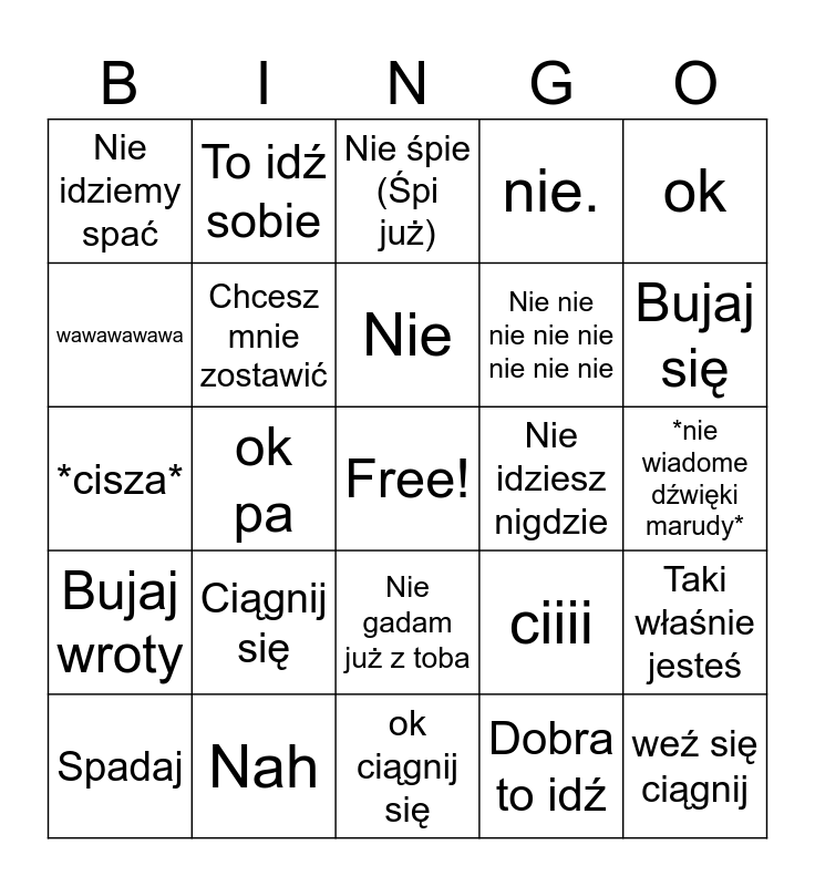 This bingo card has a free space and 24 words: Ciągnij się, Nah, Nie, Spadaj, ok, Nie idziemy spać, wawawawawa, To idź sobie, Nie idziesz nigdzie, Nie gadam już z toba, Nie nie nie nie nie nie nie nie, *cisza*, ciiii, Taki właśnie jesteś, Chcesz mnie zostawić, Dobra to idź, *nie wiadome dźwięki marudy*, Nie śpie (Śpi już), Bujaj się, ok pa, weź się ciągnij, Bujaj wroty, nie. and ok ciągnij się.