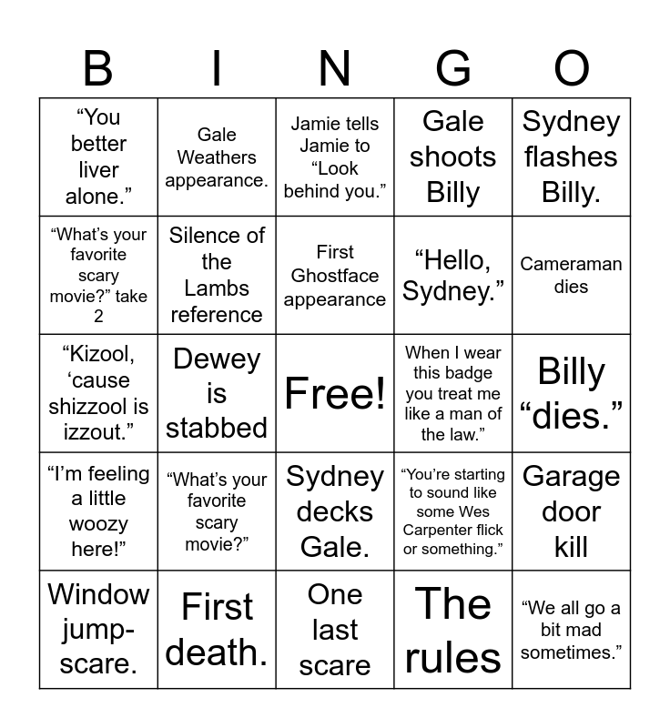 This bingo card has a free space and 24 words: “What’s your favorite scary movie?”, First death., First Ghostface appearance, Window jump-scare., Sydney flashes Billy., “You better liver alone.”, “What’s your favorite scary movie?” take 2, Gale Weathers appearance., When I wear this badge you treat me like a man of the law.”, Sydney decks Gale., “Hello, Sydney.”, “Kizool, ‘cause shizzool is izzout.”, “You’re starting to sound like some Wes Carpenter flick or something.”, Garage door kill, Silence of the Lambs reference, The rules, Billy “dies.”, Jamie tells Jamie to “Look behind you.”, Cameraman dies, Dewey is stabbed, “We all go a bit mad sometimes.”, “I’m feeling a little woozy here!”, Gale shoots Billy and One last scare.