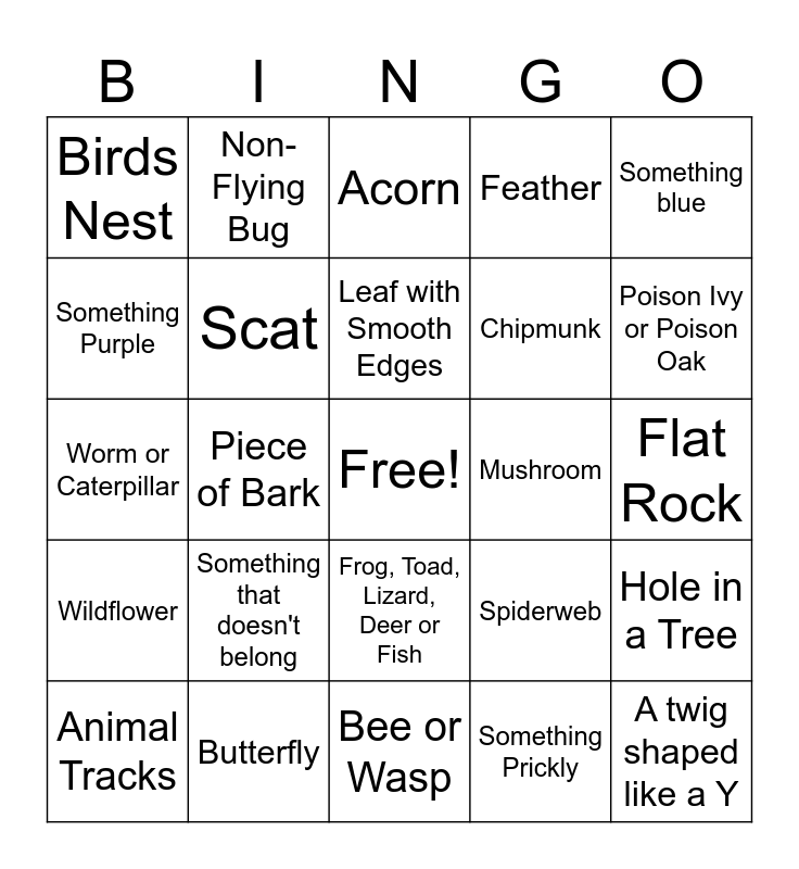 This bingo card has a free space and 27 words: Spiderweb, Moss, Chipmunk, Bee or Wasp, Something Purple, Acorn, Non-Flying Bug, Wildflower, Mushroom, Hole in a Tree, Worm or Caterpillar, Feather, Animal Tracks, Butterfly, Poison Ivy or Poison Oak, Dead but standing tree, Scat, Leaf with Smooth Edges, Something that doesn't belong, Birds Nest, Flat Rock, Something Prickly, Piece of Bark, A twig shaped like a Y, Frog, Toad, Lizard, Deer or Fish, Something blue and Fruit.