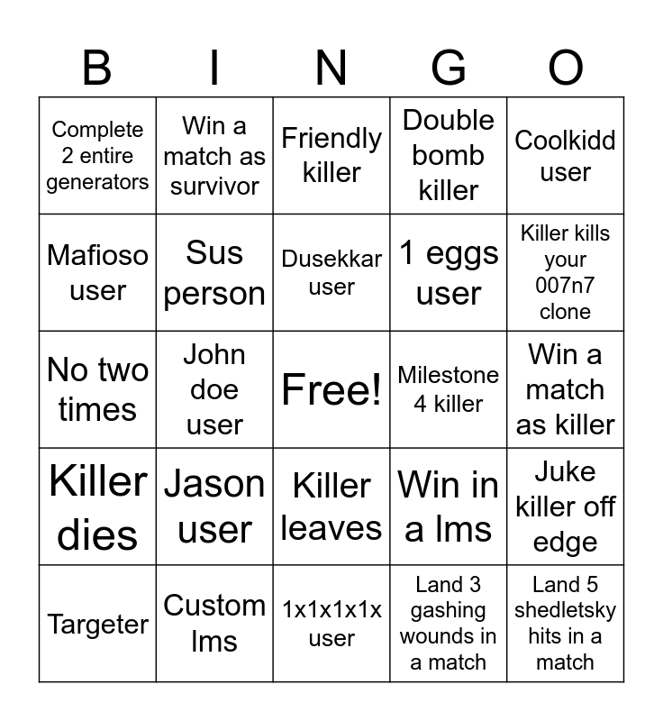 This bingo card has a free space and 24 words: Jason user, Custom lms, Dusekkar user, Targeter, Coolkidd user, Complete 2 entire generators, Mafioso user, Win a match as survivor, Milestone 4 killer, Killer leaves, 1 eggs user, No two times, Win in a lms, Juke killer off edge, Sus person, Land 3 gashing wounds in a match, Win a match as killer, Friendly killer, Killer kills your 007n7 clone, John doe user, Land 5 shedletsky hits in a match, Killer dies, Double bomb killer and 1x1x1x1x user.