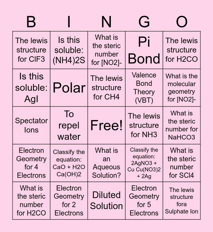 This bingo card has a free space and 58 words: Valence Shell Electron Pair Repulsion (VSEPR) Theory, Electron Geometry for 2 Electrons, Electron Geometry for 3 Electrons, Electron Geometry for 4 Electrons, Electron Geometry for 5 Electrons, Electron Geometry for 6 Electrons, Polar, Nonpolar, Valence Bond Theory (VBT), Sigma Bond, Pi Bond, Molecular Orbit (MO) Theory, Paramagnetic, Diamagnetic, The lewis structure for CF2Br2, The lewis structure for ClF3, The lewis structure fora Sulphate Ion, The lewis structure for H2CO, The lewis structure for NO, The lewis structure for CH4, The lewis structure for NH3, What is the steric number for [NO2]-, What is the steric number for H2CO, What is the steric number for SCl4, What is the steric number for C6H12O6, What is the steric number for NaHCO3, What is the steric number for IF7, What is the steric number for NaCl, What is the molecular geometry for [NO2]-, What is the molecular geometry for [XeF3]-, What is the molecular geometry for SF4, What is the molecular geometry for PtCl2(NH3)2, What is the molecular geometry for XeOF4, What is the molecular geometry for H2O, What is the molecular geometry for SCl4, List bonds from most to least repulsive, To be attracted to water, To repel water, Spectator Ions, Nonelectrolytes, Classify the equation: CaO + H2O Ca(OH)2, Classify the equation: 2NaN3 2Na + 3N2, Classify the equation: 2AgNO3 + Cu Cu(NO3)2 + 2Ag, Classify the equation: BaCl2 + Na2SO4 BaSO4 + 2NaCl, Classify the equation: C2H5OH + 3O2 2CO2+ 3H2O, Balance the equation: HgO Hg +O2, Balance the equation: Zn + HCl ZnCl2 + H, What is an Aqueous Solution?, Diluted Solution, Oxidation, Reduction, Theoretical Yield, The product that gets used up first in a reaction, What is Molarity?, Is this soluble: (NH4)2S, Is this soluble: K2CO3, Is this soluble: AgI and Is this soluble: AgNO3.