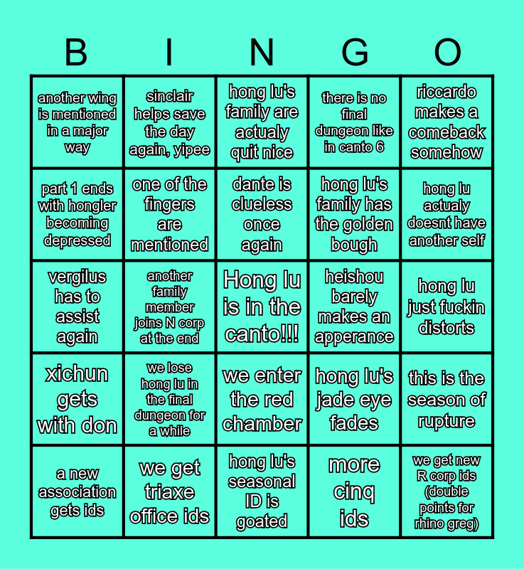 This bingo card has a free space and 24 words: we lose hong lu in the final dungeon for a while, we get triaxe office ids, dante is clueless once again, a new association gets ids, riccardo makes a comeback somehow, another wing is mentioned in a major way, part 1 ends with hongler becoming depressed, sinclair helps save the day again, yipee, heishou barely makes an apperance, we enter the red chamber, hong lu's family has the golden bough, vergilus has to assist again, hong lu's jade eye fades, this is the season of rupture, one of the fingers are mentioned, more cinq ids, hong lu just fuckin distorts, hong lu's family are actualy quit nice, hong lu actualy doesnt have another self, another family member joins N corp at the end, we get new R corp ids (double points for rhino greg), xichun gets with don, there is no final dungeon like in canto 6 and hong lu's seasonal ID is goated.