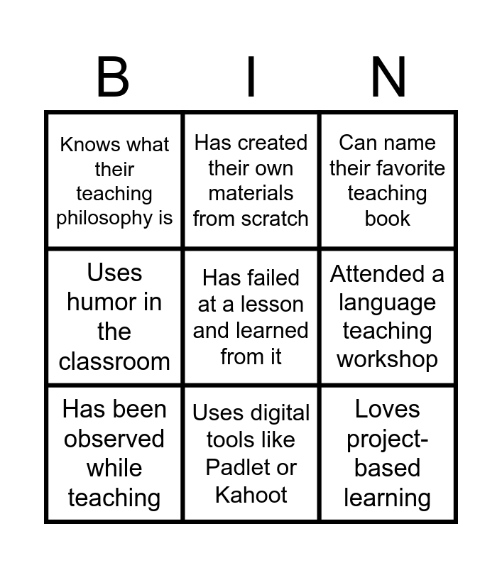 This bingo card has 26 words: Free!, Has taught a class online, Uses digital tools like Padlet or Kahoot, Speaks three or more languages, Has failed at a lesson and learned from it, Knows what their teaching philosophy is, Attended a language teaching workshop, Has created their own materials from scratch, Is passionate about learner autonomy, Has worked with adult learners, Loves project-based learning, Has collaborated on a curriculum design, Wants to pursue a PhD, Has had a mentor in education, Believes in inclusive education, Has assessed students using rubrics, Uses humor in the classroom, Keeps a teaching journal or notes, Can name their favorite teaching book, Has adapted lessons for learners with disabilities, Enjoys group work more than lecturing, Has created or used an e-portfolio, Grew up in a multilingual environment, Has taught a lesson using only visuals, Has been observed while teaching and Is curious about AI in education.