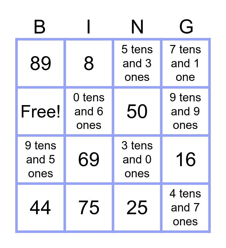 This bingo card has 16 words: 75, 16, 5 tens and 3 ones, 89, 9 tens and 5 ones, 8, 3 tens and 0 ones, 25, Free!, 0 tens and 6 ones, 44, 7 tens and 1 one, 69, 9 tens and 9 ones, 50 and 4 tens and 7 ones.