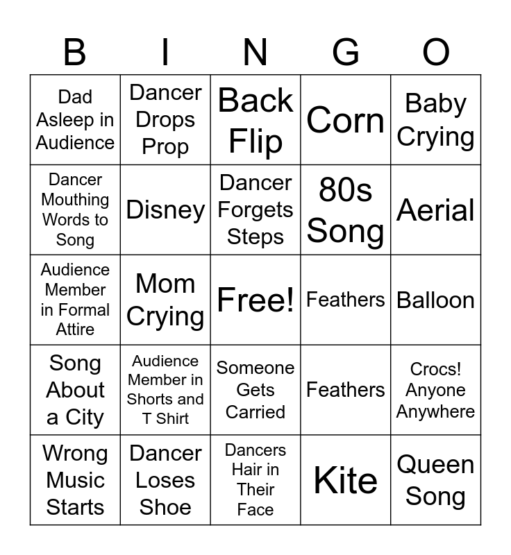 This bingo card has a free space and 24 words: Audience Member in Shorts and T Shirt, Dancer Loses Shoe, Dancer Forgets Steps, Wrong Music Starts, Baby Crying, Dad Asleep in Audience, Dancer Mouthing Words to Song, Dancer Drops Prop, Feathers, Someone Gets Carried, 80s Song, Audience Member in Formal Attire, Feathers, Crocs! Anyone Anywhere, Disney, Kite, Balloon, Back Flip, Aerial, Mom Crying, Queen Song, Song About a City, Corn and Dancers Hair in Their Face.
