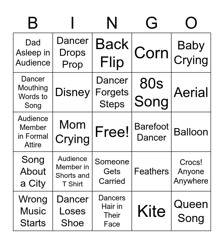 This bingo card has a free space and 24 words: Audience Member in Shorts and T Shirt, Dancer Loses Shoe, Dancer Forgets Steps, Wrong Music Starts, Baby Crying, Dad Asleep in Audience, Dancer Mouthing Words to Song, Dancer Drops Prop, Barefoot Dancer, Someone Gets Carried, 80s Song, Audience Member in Formal Attire, Feathers, Crocs! Anyone Anywhere, Disney, Kite, Balloon, Back Flip, Aerial, Mom Crying, Queen Song, Song About a City, Corn and Dancers Hair in Their Face.