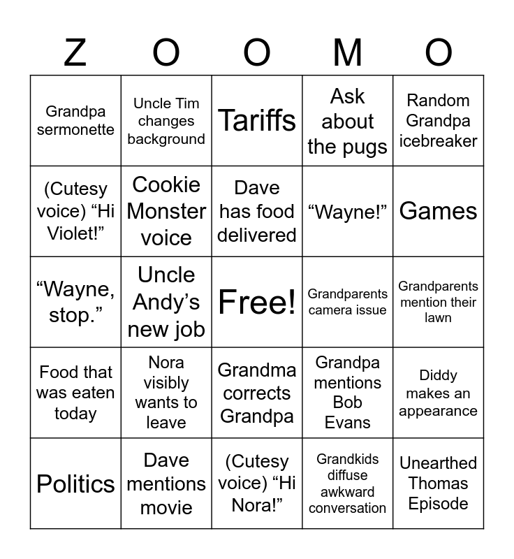 This bingo card has a free space and 24 words: Nora visibly wants to leave, Dave mentions movie, Dave has food delivered, Politics, Random Grandpa icebreaker, Grandpa sermonette, (Cutesy voice) “Hi Violet!”, Uncle Tim changes background, Grandparents camera issue, Grandma corrects Grandpa, “Wayne!”, “Wayne, stop.”, Grandpa mentions Bob Evans, Diddy makes an appearance, Cookie Monster voice, Grandkids diffuse awkward conversation, Grandparents mention their lawn, Tariffs, Games, Uncle Andy’s new job, Unearthed Thomas Episode, Food that was eaten today, Ask about the pugs and (Cutesy voice) “Hi Nora!”.