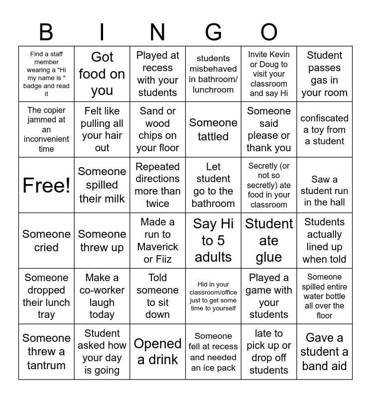 This bingo card has 36 words: Hid in your classroom/office just to get some time to yourself, Told someone to sit down, Someone fell at recess and needed an ice pack, The copier jammed at an inconvenient time, Someone cried, Let student go to the bathroom, Felt like pulling all your hair out, Opened a drink, Invite Kevin or Doug to visit your classroom and say Hi, Played a game with your students, confiscated a toy from a student, students misbehaved in bathroom/ lunchroom, Someone spilled entire water bottle all over the floor, Someone spilled their milk, Someone tattled, Find a staff member wearing a "Hi my name is " badge and read it, Someone dropped their lunch tray, Secretly (or not so secretly) ate food in your classroom, Free!, Played at recess with your students, Repeated directions more than twice, Someone threw up, Say Hi to 5 adults, Made a run to Maverick or Fiiz, Student ate glue, Got food on you, Someone said please or thank you, Student asked how your day is going, Sand or wood chips on your floor, Student passes gas in your room, Gave a student a band aid, Someone threw a tantrum, Students actually lined up when told, Saw a student run in the hall, Make a co-worker laugh today and late to pick up or drop off students.