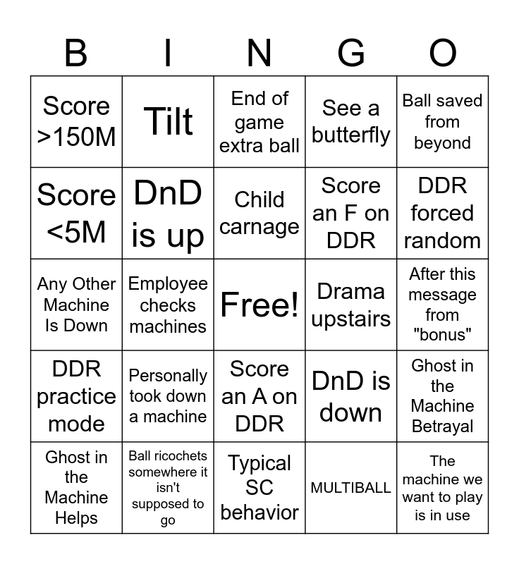 This bingo card has a free space and 24 words: Personally took down a machine, Ball ricochets somewhere it isn't supposed to go, Child carnage, Ghost in the Machine Helps, Ball saved from beyond, Score >150M, Score <5M, Tilt, Drama upstairs, Score an A on DDR, Score an F on DDR, Any Other Machine Is Down, DnD is down, Ghost in the Machine Betrayal, DnD is up, MULTIBALL, After this message from "bonus", End of game extra ball, DDR forced random, Employee checks machines, The machine we want to play is in use, DDR practice mode, See a butterfly and Typical SC behavior.