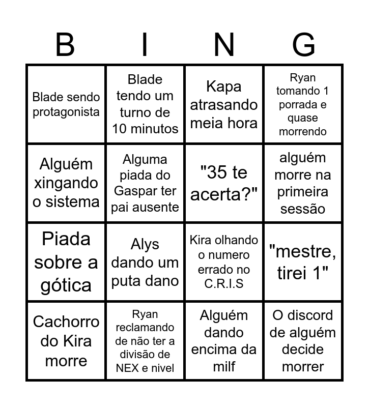 This bingo card has 17 words: Alguém dando encima da milf, Cachorro do Kira morre, Kapa atrasando meia hora, Blade sendo protagonista, Alys dando um puta dano, Ryan tomando 1 porrada e quase morrendo, "mestre, tirei 1", "35 te acerta?", alguém morre na primeira sessão, Alguma piada do Gaspar ter pai ausente, Ryan reclamando de não ter a divisão de NEX e nivel, Kira olhando o numero errado no C.R.I.S, Alguém xingando o sistema, Blade tendo um turno de 10 minutos, Piada sobre a gótica, Internet de alguém cai and O discord de alguém decide morrer.