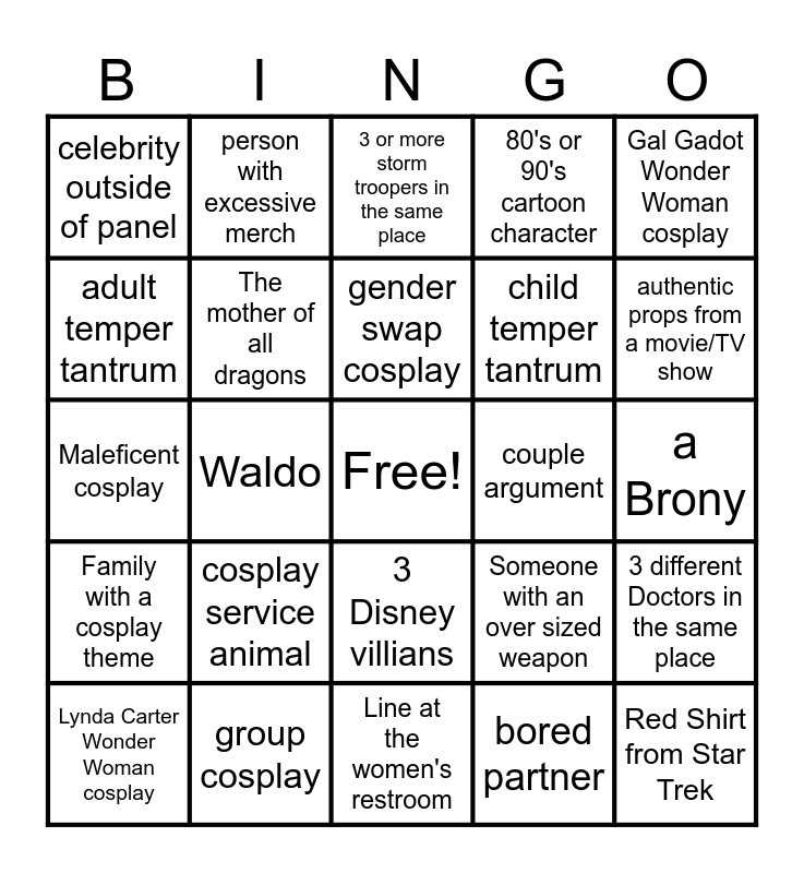 This bingo card has a free space and 24 words: cosplay service animal, group cosplay, gender swap cosplay, Lynda Carter Wonder Woman cosplay, Gal Gadot Wonder Woman cosplay, celebrity outside of panel, adult temper tantrum, person with excessive merch, couple argument, 3 Disney villians, child temper tantrum, Maleficent cosplay, Someone with an over sized weapon, 3 different Doctors in the same place, The mother of all dragons, bored partner, a Brony, 3 or more storm troopers in the same place, authentic props from a movie/TV show, Waldo, Red Shirt from Star Trek, Family with a cosplay theme, 80's or 90's cartoon character and Line at the women's restroom.