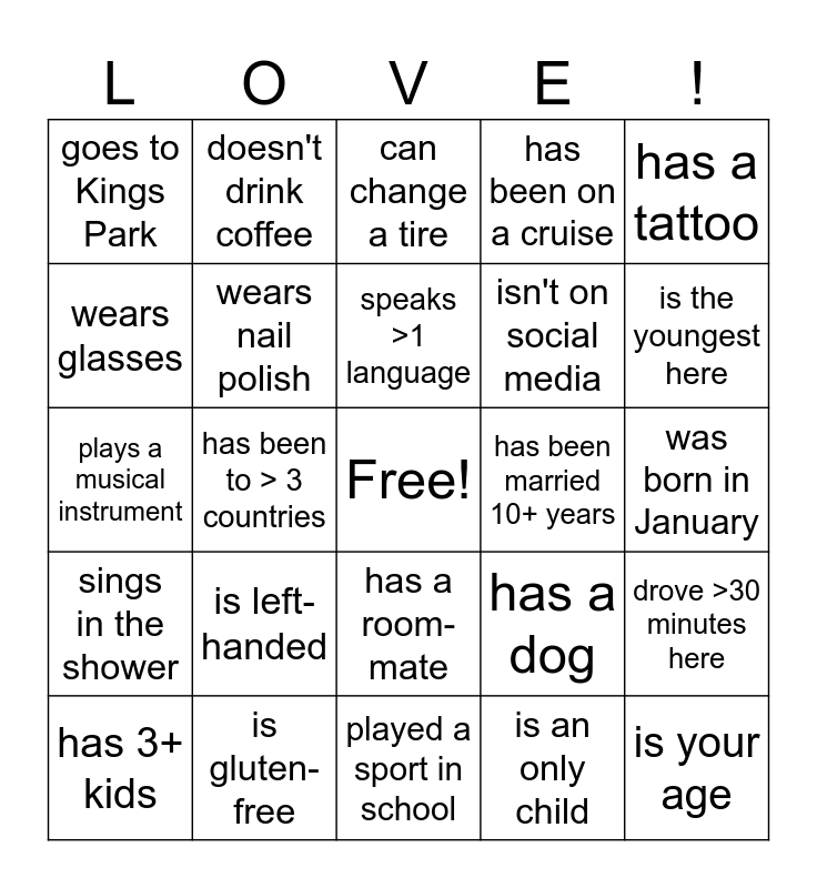 This bingo card has a free space and 24 words: is left-handed, is gluten-free, speaks >1 language, has 3+ kids, has a tattoo, goes to Kings Park, wears glasses, doesn't drink coffee, has been married 10+ years, has a room-mate, isn't on social media, plays a musical instrument, has a dog, drove >30 minutes here, wears nail polish, is an only child, was born in January, can change a tire, is the youngest here, has been to > 3 countries, is your age, sings in the shower, has been on a cruise and played a sport in school.