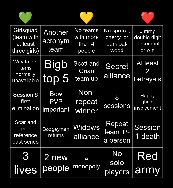 This bingo card has a free space and 24 words: 3 lives, Boogeyman returns, Scott and Grian team up, No solo players, Jimmy double digit placement or win, Girlsquad (team with at least three girls), Another acronym team, No teams with more than 4 people, 8 sessions, Happy ghast involvement, Session 6 first elimination, Bigb top 5, Repeat team +/- a person, Session 1 death, Way to get items normally unavailable, 2 new people, A monopoly, No spruce, cherry, or dark oak wood, At least 2 betrayals, Scar and grian reference past series, Bow PVP important, Widows alliance, Secret alliance and Red army.