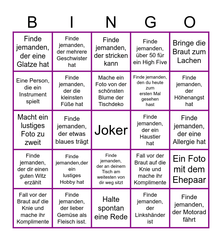 This bingo card has a free space and 24 words: Finde jemanden,der ein lustiges Hobby hat, Finde jemanden, der lieber Gemüse als Fleisch isst., Mache ein Foto von der schönsten Blume der Tischdeko, Fall vor der Braut auf die Knie und mache ihr Komplimente, Bringe die Braut zum Lachen, Finde jemanden, der eine Glatze hat, Eine Person, die ein Instrument spielt, Finde jemanden, der mehrere Geschwister hat, Finde jemanden, der ein Haustier hat, Finde jemanden, der an deinem Tisch am weitesten von dir weg sitzt, Finde jemanden, den du heute zum ersten Mal gesehen hast, Macht ein lustiges Foto zu zweit, Fall vor der Braut auf die Knie und mache ihr Komplimente, Ein Foto mit dem Ehepaar, Finde jemanden, der die kleinsten Füße hat, Finde jemanden, der Linkshänder ist, Finde jemanden, der eine Allergie hat, Finde jemanden, der stricken kann, Finde jemanden, der Höhenangst hat, Finde jemanden, der etwas blaues trägt, Finde jemanden, der Motorad fährt, Finde jemanden, der dir einen guten Witz erzählt, Finde jemanden, über 50 für ein High Five and Halte spontan eine Rede.