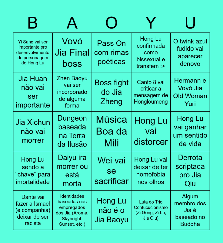 This bingo card has a free space and 24 words: Daiyu ira morrer ou está morta, Identidades baseadas nas empregados dos Jia (Aroma, Skybright, Sunset, etc.), Boss fight do Jia Zheng, Dante vai fazer a Ismael (e companhia) deixar de ser racista, O twink azul fudido vai aparecer denovo, Yi Sang vai ser importante pro desenvolvimento de personagem do Hong Lu, Jia Huan não vai ser importante, Vovó Jia Final boss, Hong Lu vai distorcer, Wei vai se sacrificar, Canto 8 vai criticar a mensagem de Hongloumeng, Jia Xichun não vai morrer, Hong Lu vai deixar de ter homofobia nos olhos, Derrota scriptada pro Jia Qiu, Zhen Baoyu vai ser incorporado de alguma forma, Luta do Trio Confucucionismo (Zi Gong, Zi Lu, Jia Qiu), Hong Lu vai ganhar um sentido de vida, Pass On com rimas poéticas, Hermann e Vovó Jia Old Woman Yuri, Dungeon baseada na Terra da Ilusão, Algum membro dos Jia é baseado no Buddha, Hong Lu sendo a ¨chave¨ para imortalidade, Hong Lu confirmada como bissexual e transfem :> and Hong Lu não é o Jia Baoyu.