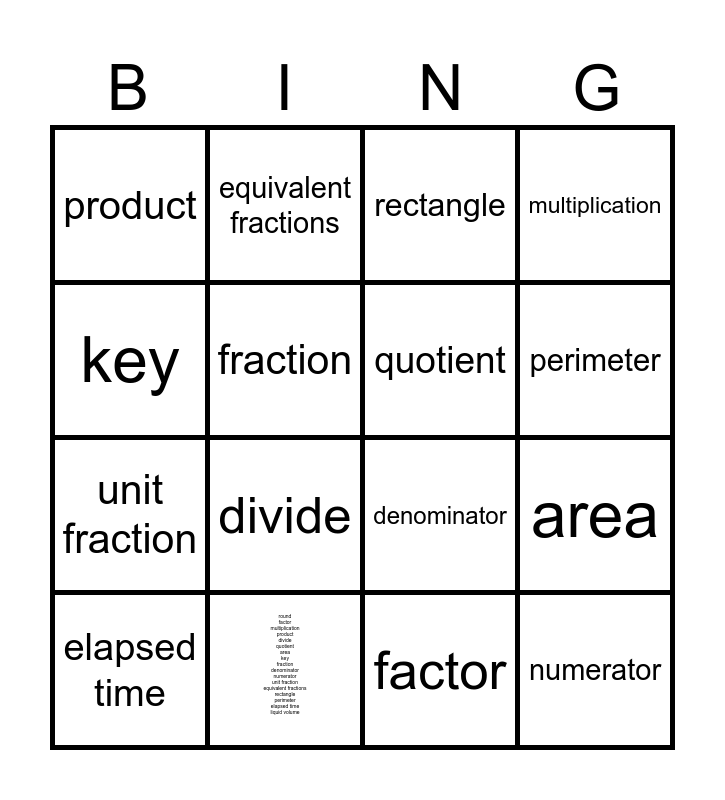 This bingo card has 17 words: round factor multiplication product divide quotient area key fraction denominator numerator unit fraction equivalent fractions rectangle perimeter elapsed time liquid volume, factor, multiplication, product, divide, quotient, area, key, fraction, denominator, numerator, unit fraction, equivalent fractions, rectangle, perimeter, elapsed time and liquid volume.