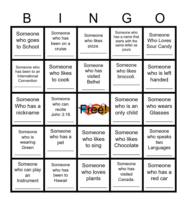This bingo card has a free space and 24 words: Someone who has a pet __________, Someone who has been to Hawaii ___________, Someone who has visited Bethel _________, Someone who can play an Instrument __________, Someone Who Loves Sour Candy __________, Someone who goes to School _________, Someone who has been to an International Convention _____________, Someone who has been on a cruise ___________, Someone who is an only child _________, Someone who likes to sing _________, Someone who likes broccoli. __________, Someone Who has a nickname _________, Someone who likes Chocolate _________, Someone who speaks two Languages __________, Someone who likes to cook _________, Someone who has visited Canada. ___________, Someone who wears Glasses _________, Someone who likes pizza. ___________, Someone who is left handed _________, Someone who can recite John 3:16 ___________, Someone who has a red car _________, Someone who is wearing Green ___________, Someone who has a name that starts with the same letter as yours ______________ and Someone who loves plants _________.