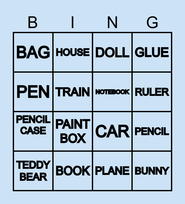 This bingo card has 16 words: BOOK, PENCIL, DOLL, BAG, PENCIL CASE, HOUSE, CAR, PLANE, PEN, TRAIN, TEDDY BEAR, GLUE, PAINT BOX, RULER, NOTEBOOK and BUNNY.