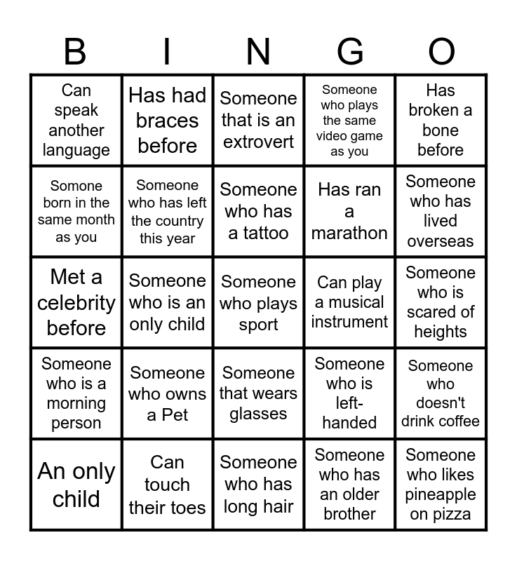 This bingo card has 25 words: Someone who owns a Pet, Someone who has long hair, Someone who has a tattoo, An only child, Has broken a bone before, Can speak another language, Somone born in the same month as you, Has had braces before, Can play a musical instrument, Someone that wears glasses, Has ran a marathon, Met a celebrity before, Someone who is left-handed, Someone who doesn't drink coffee, Someone who has left the country this year, Someone who likes pineapple on pizza, Someone who is scared of heights, Someone that is an extrovert, Someone who has lived overseas, Someone who is an only child, Someone who plays sport, Can touch their toes, Someone who is a morning person, Someone who plays the same video game as you and Someone who has an older brother.