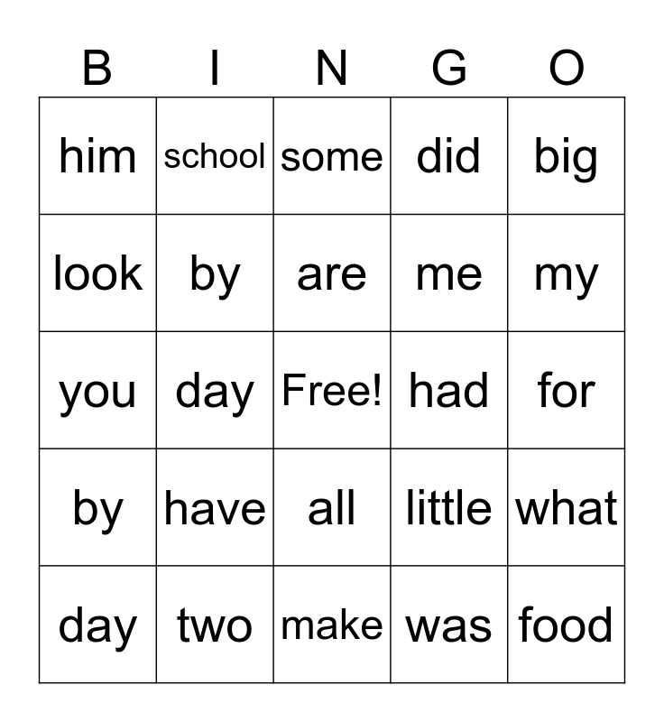 This bingo card has a free space and 39 words: all, are, be, by, day, all, are, be, big, by, day, did, food, for, had, have, he, him, just, little, look, make, me, my, not, on, one, or, out, school, she, so, some, two, was, will, what, you and your.