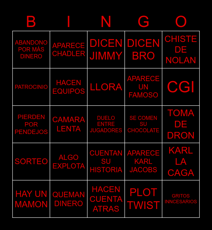 This bingo card has a free space and 24 words: ALGO EXPLOTA, QUEMAN DINERO, LLORA, HAY UN MAMON, CHISTE DE NOLAN, ABANDONO POR MÁS DINERO, PATROCINIO, APARECE CHADLER, SE COMEN SU CHOCOLATE, CUENTAN SU HISTORIA, APARECE UN FAMOSO, PIERDEN POR PENDEJOS, APARECE KARL JACOBS, KARL LA CAGA, HACEN EQUIPOS, PLOT TWIST, TOMA DE DRON, DICEN JIMMY, CGI, CAMARA LENTA, GRITOS INNCESARIOS, SORTEO, DICEN BRO and HACEN CUENTA ATRAS.