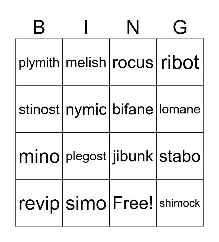 This bingo card has 17 words: Free!, revip, rocus, plymith, plegost, ribot, stabo, bifane, lomane, nymic, simo, jibunk, stinost, melish, mino, dremand and shimock.