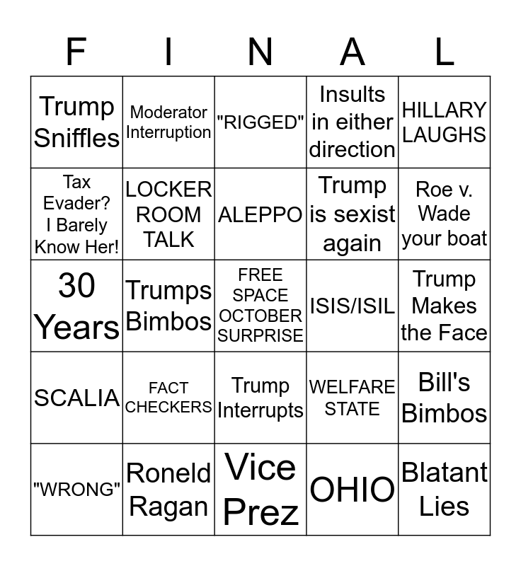 This bingo card has a free space and 34 words: OBAMA, OHIO, EMAILS, MEXICANS, SCALIA, LOCKER ROOM TALK, HILLARY LAUGHS, "WRONG", Moderator Interruption, Benghazi, ALEPPO, "RIGGED", Russia, Obama Love. Obama Care., ISIS/ISIL, Roe v. Wade your boat, Roneld Ragan, 30 Years, FACT CHECKERS, WELFARE STATE, Trump Interrupts, Hillary Interrupts, Trump Sniffles, Trump Makes the Face, Vice Prez, Blatant Lies, Insults in either direction, GHINA, Trump is sexist again, Tax Evader? I Barely Know Her!, GUN CONTROL, Trumps Bimbos, Bill's Bimbos and "This Man is Not Fit".