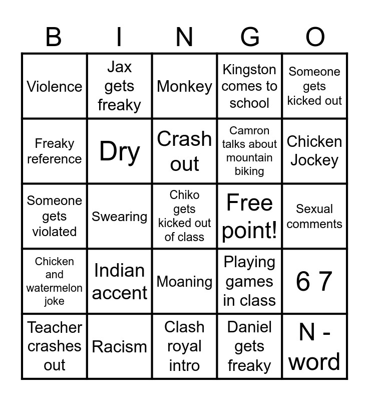 This bingo card has a free space and 24 words: Indian accent, Racism, Crash out, Teacher crashes out, Someone gets kicked out, Violence, Freaky reference, Jax gets freaky, Free point!, Moaning, Camron talks about mountain biking, Someone gets violated, Playing games in class, 6 7, Dry, Daniel gets freaky, Sexual comments, Monkey, Chicken Jockey, Swearing, N - word, Chicken and watermelon joke, Kingston comes to school and Clash royal intro.