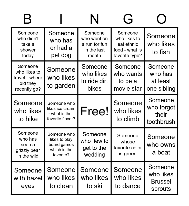 This bingo card has a free space and 29 words: Someone with hazel eyes, Someone who lives outside Idaho, Someone who likes ice cream - what is their favorite flavor?, Someone who likes to sing, Someone who didn't take a shower today, Someone who went on a run for fun in the last month, Someone who likes to garden, Someone who likes to play board games - which is their favorite?, Someone who likes to climb, Someone who likes to clean, Someone who forgot their toothbrush, Someone who likes Brussel sprouts, Someone who likes to ski, Someone who likes to dance, Someone who has at least one sibling, Someone who likes to cook, Someone who flew to get to the wedding, Someone who has seen a grizzly bear in the wild, Someone who likes to fish, Someone who likes to hike, Someone whose favorite color is green, Someone who is left handed, Someone who wants to be a movie star, Someone who likes to travel - where did they recently go?, Someone who likes to eat ethnic food - what is favorite type?, Someone who has or had a pet dog, Someone who owns a boat, Someone who likes to ride dirt bikes and Someone who is younger than 10.