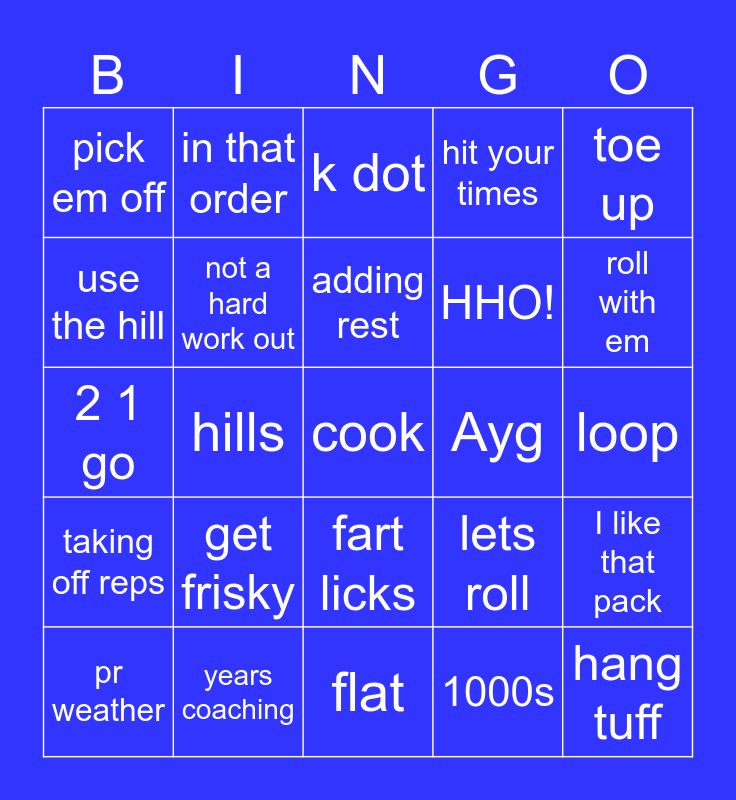 This bingo card has a free space and 24 words: get frisky, years coaching, adding rest, pr weather, toe up, pick em off, use the hill, in that order, Ayg, fart licks, HHO!, 2 1 go, lets roll, I like that pack, not a hard work out, 1000s, loop, k dot, roll with em, hills, hang tuff, taking off reps, hit your times and flat.