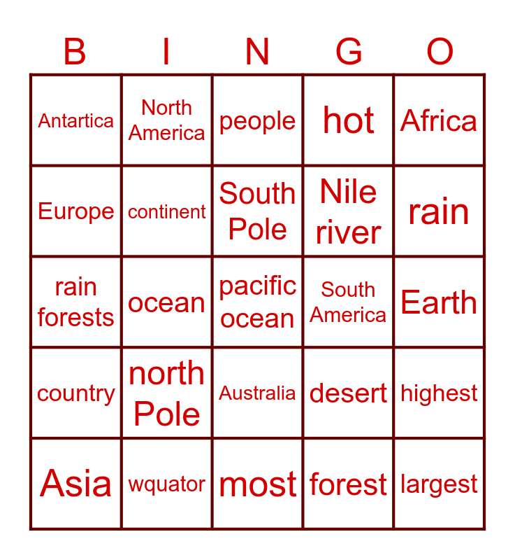 This bingo card has a free space and 24 words: north Pole, wquator, South Pole, Asia, Africa, Antartica, Europe, North America, South America, Australia, Nile river, rain forests, desert, highest, continent, forest, Earth, people, rain, ocean, largest, country, hot and most.