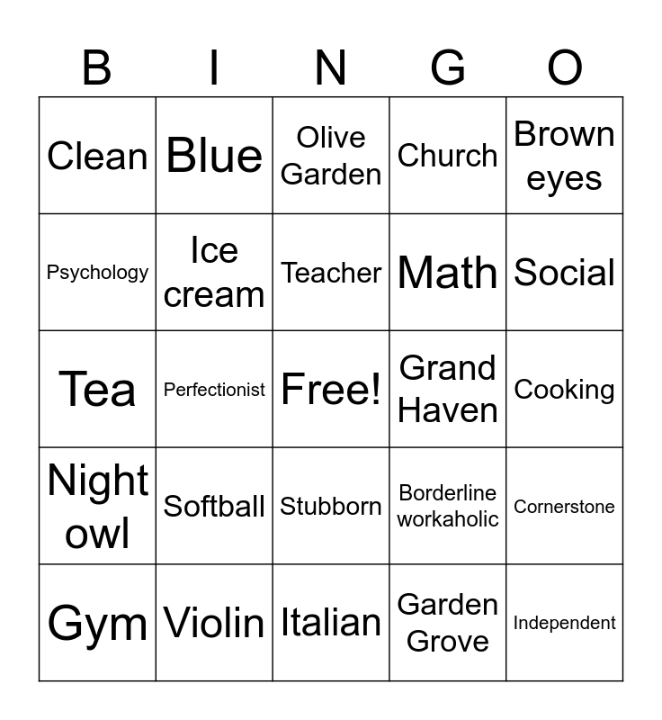 This bingo card has a free space and 24 words: Softball, Violin, Teacher, Gym, Brown eyes, Clean, Psychology, Blue, Grand Haven, Stubborn, Math, Tea, Borderline workaholic, Cornerstone, Ice cream, Garden Grove, Cooking, Olive Garden, Social, Perfectionist, Independent, Night owl, Church and Italian.