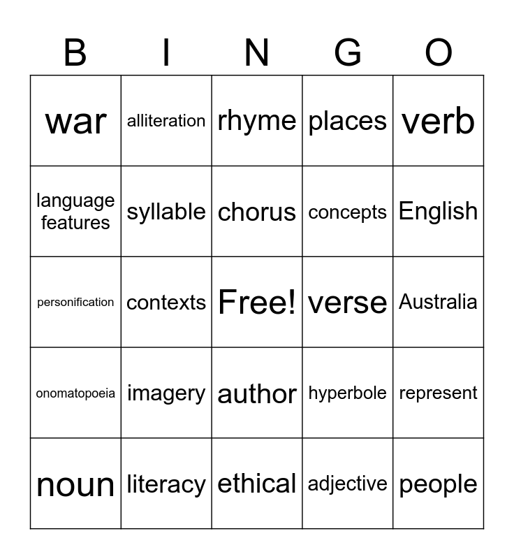 This bingo card has a free space and 34 words: poem, adjective, repetition, poetry, onomatopoeia, syllable, verb, noun, alliteration, stanza, chorus, rhyme, simile, metaphor, verse, English, literacy, personification, imagery, hyperbole, author, artist, war, Australia, ethical, people, places, events, concepts, language features, text structures, contexts, represent and literary device.