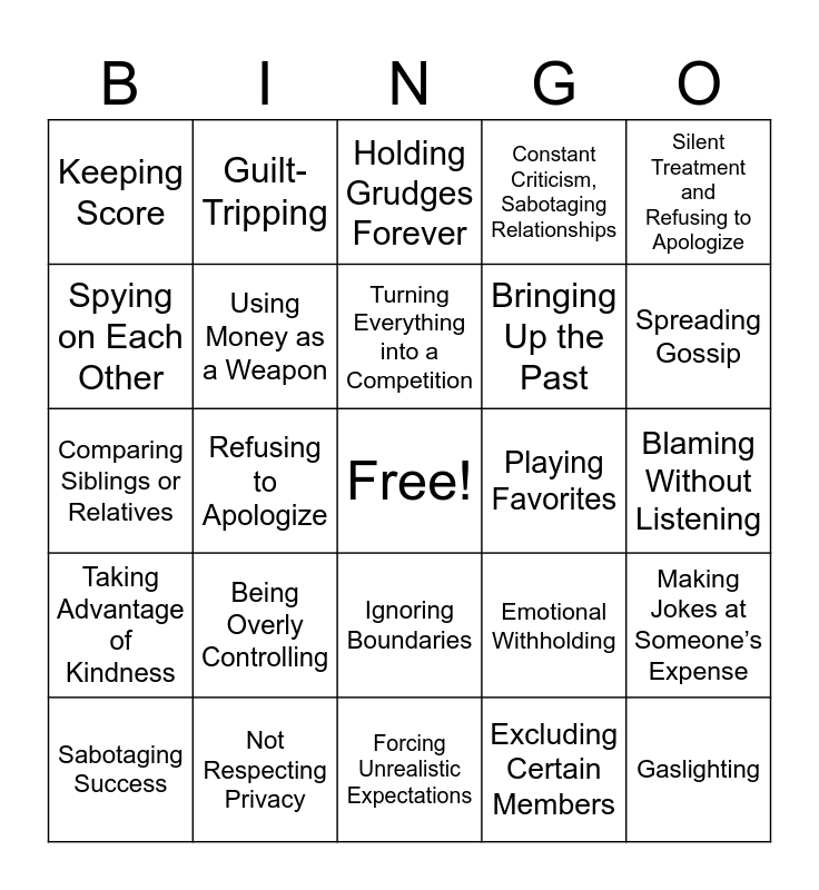 This bingo card has a free space and 24 words: Being Overly Controlling, Not Respecting Privacy, Turning Everything into a Competition, Sabotaging Success, Silent Treatment and Refusing to Apologize, Keeping Score, Spying on Each Other, Guilt-Tripping, Playing Favorites, Ignoring Boundaries, Bringing Up the Past, Comparing Siblings or Relatives, Emotional Withholding, Making Jokes at Someone’s Expense, Using Money as a Weapon, Excluding Certain Members, Blaming Without Listening, Holding Grudges Forever, Spreading Gossip, Refusing to Apologize, Gaslighting, Taking Advantage of Kindness, Constant Criticism, Sabotaging Relationships and Forcing Unrealistic Expectations.